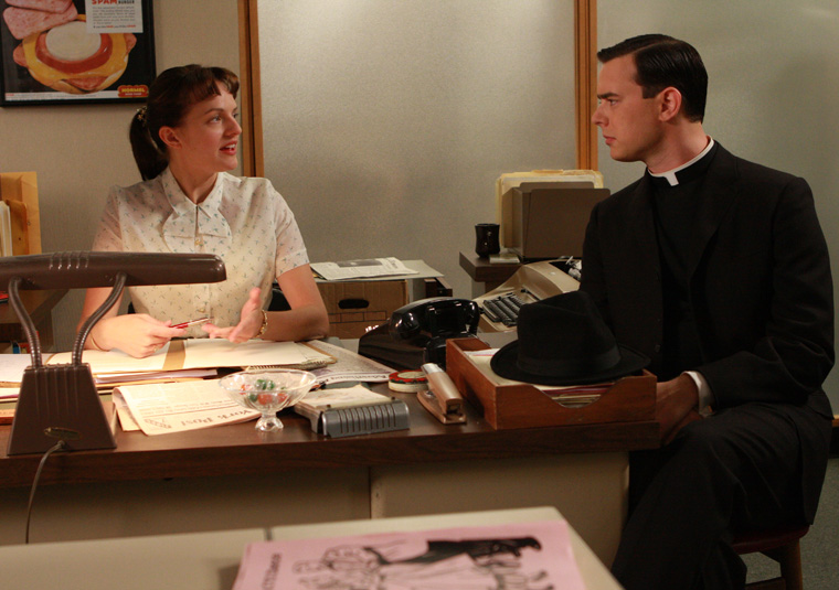 Peggy keeps her composure while working through in miniature the same creative/accounts/client struggles Don and Duck recently resolved but weakens when Father Gill probes her about her sins. He wants her to confess and wants her to come back tightly into the church’s embrace, but she resists. Her eyes moisten during the interrogation, but not until she’s alone in the bath – her armor of high collar and bangs removed – does she finally break down.